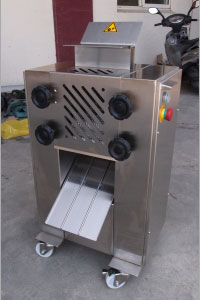 6、确认旋转方向正确后,把带筋膜的肉,皮朝下放在刀片上,轻踩脚踏板把肉往前推即可。